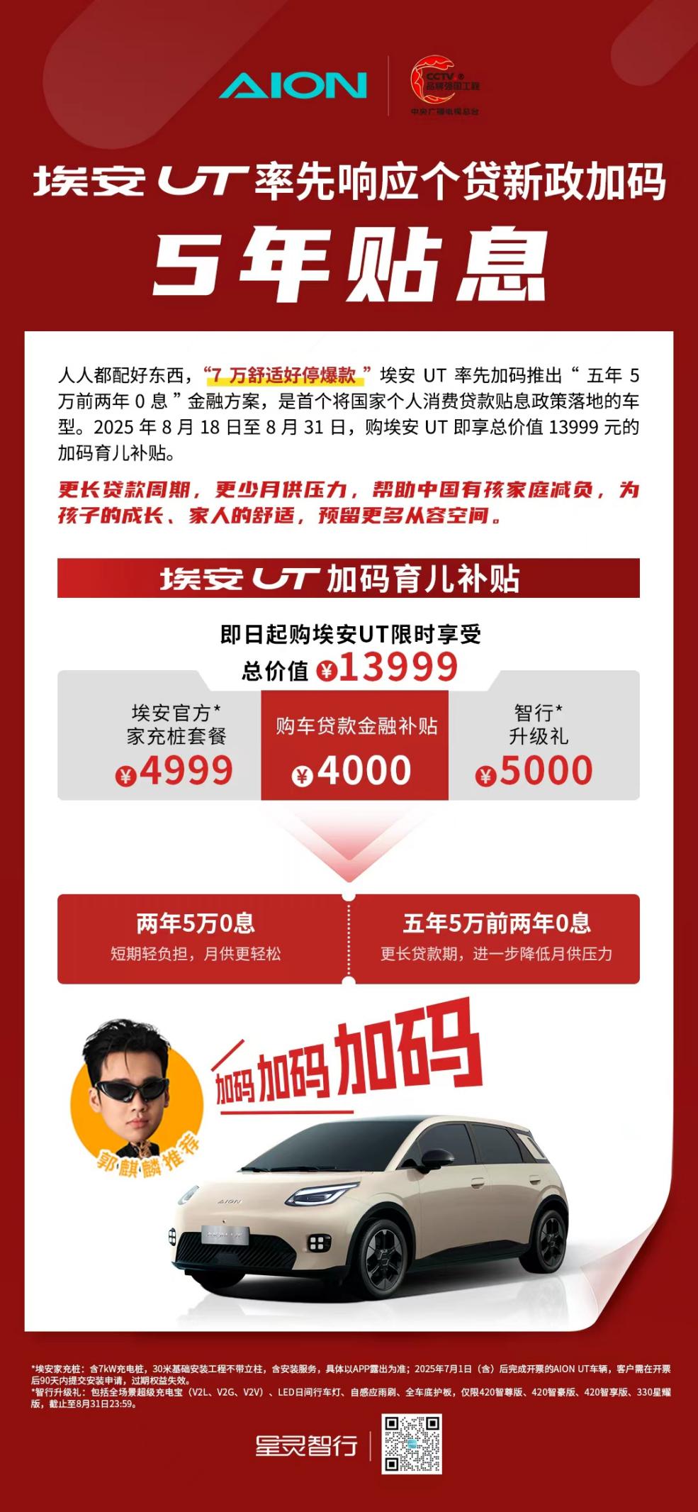 而在汽车产业领域,“7万舒适好停爆款”埃安UT率先加码推出“五年5万前两年0息”金融方案,是首个将国家个人消费贷款贴息政策落地的车型。2025年8月18日至8月31日,购埃安UT即享总价值13999元的加码育儿补贴,包括了价值4999元官方家充桩套餐、价值5000元的智行升级礼,以及价值4000元的购车贷款金融补贴。加码5年贴息后,埃安UT车主可根据个人实际需求,从“两年5万0息”以及“五年5万前两年0息”两种金融方案中选择其一,月供可低至833元,帮助中国有孩家庭减负。