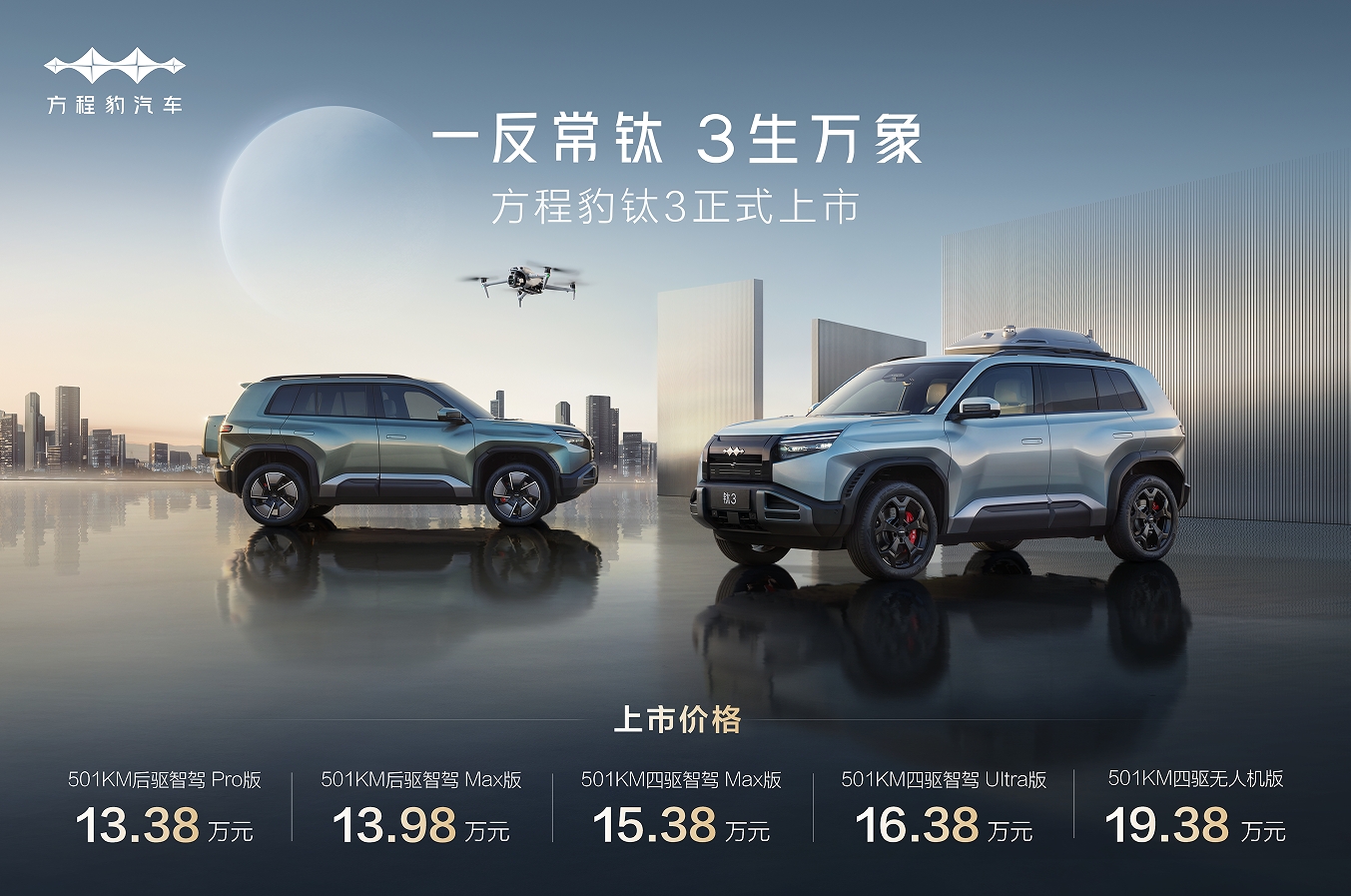 钛3的上市不仅在配置上实现了越级,更在价格和政策上展现了极大的诚意。501KM后驱智驾Pro版13.38万元、后驱智驾Max版13.98万元、四驱智驾Max版15.38万元、四驱智驾Ultra版16.38万元、四驱无人机版19.38万元,覆盖了从入门到高端的多个区间,满足了不同消费者的需求。