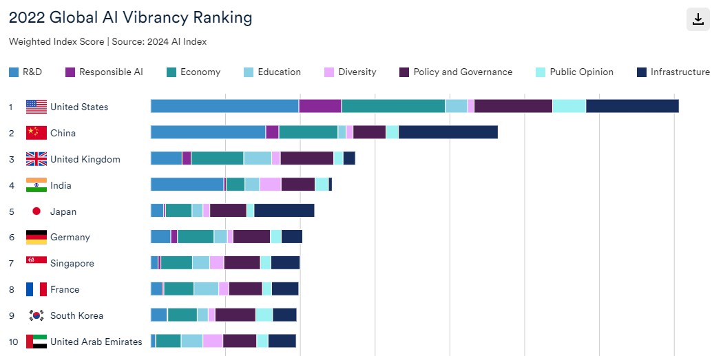斯坦福人类中心人工智能研究所发布的“全球人工智能活力排名”