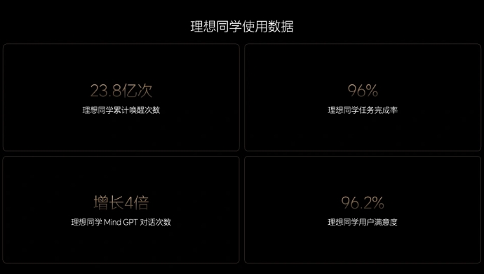 “理想同学”累计唤醒次数达到23.8亿次,任务完成率高达96%,用户满意度高达96.2%。这得益于其强大的对话能力、多模态交互、方言识别等特性。