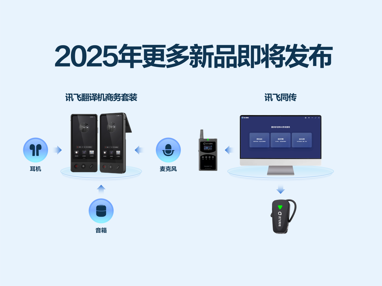 发布会最后,科大讯飞透露,针对语音到语音的同传场景,讯飞翻译机将会配置耳机、音箱、麦克风,在2025年推出商务套装,满足用户在不同的商务洽谈场景的使用需求。