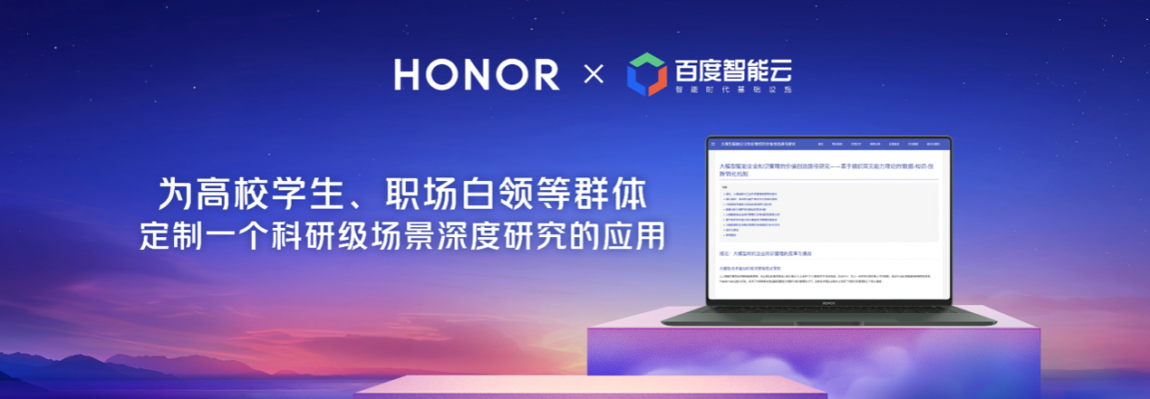基于DeepResearch能力,荣耀正在利用千帆平台,面向高校学生、职场白领等群体,打造一款科研场景深度研究的应用,将很快会在荣耀笔记本上上线。