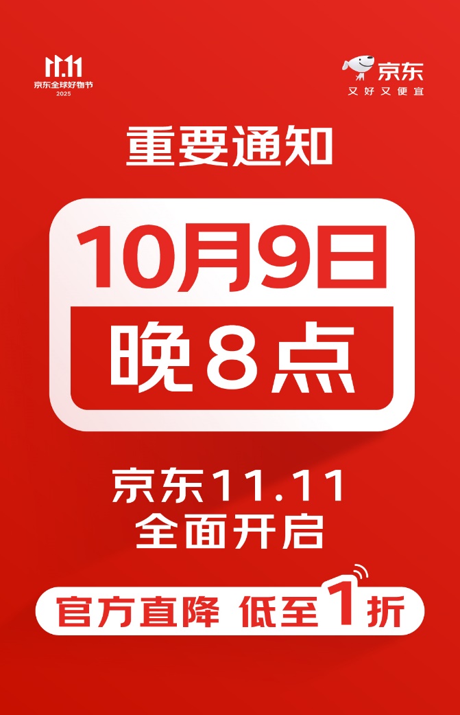 9月29日,京东宣布,今年京东11.11将于10月9日晚8点现货开卖。在汇集海量热销爆款好物的同时,将提供“官方直降 低至1折”的优惠福利,为消费者带来又好又便宜的消费体验!