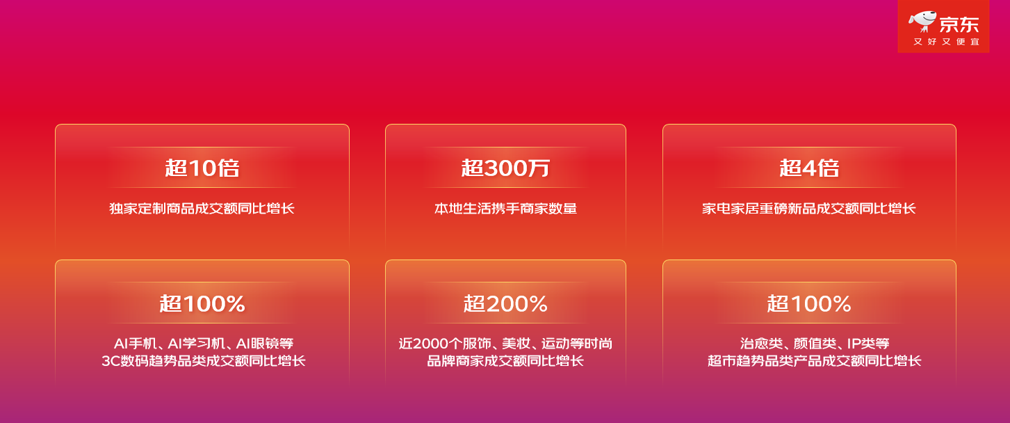 京喜自营助力出口转内销,带动外贸企业成交额同比增长20倍;京喜自营产业带优质白牌好物成交额同比增长3倍。此外,京东五金城购买用户数同比增长超63%,自营入仓品成交额增长133%,上千工业品品牌成交额倍增。京东企业购平台成交额同比增长超70%,中小企业客户数稳健攀升。