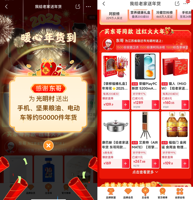 据了解,1月6日京东联合超百大品牌发起了“我给老家送年货”活动,邀请全国各地用户为家乡、为亲朋好友送上年货好礼。据“我给老家送年货”活动页面显示,“东哥”刘强东已下单年货,包含福临门食用油、洋河梦之蓝JD20、百草味坚果零食礼盒、康巴赫鸳鸯多功能锅、艾美特石墨烯暖风机、飞科博锐电动剃须刀、足力健老人雪地靴男女款、安踏卫衣、李宁卫衣、诺泰医用护腰带、博朗儿童耳温计、荣耀手机、闪克麦克风、有道电子词典、立马电动自行车、楚江荆灭火器等34款商品,吃喝穿戴样样齐全,共计约5万件。而这些年货的收货地址正是刘强东的老家宿迁来龙镇光明村。网友纷纷表示,又是羡慕光明村村民的一天。