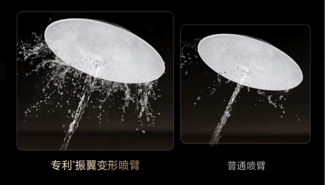 它以全球首创振翼变形喷臂专利(专利号:ZL202420524621.9) 为核心,搭配进口BLDC变频电机,不仅实现22%冲刷面积提升和52,000Pa超强水压,还利用五维喷淋系统,实现局部加强洗涤的效果,彻底解决洗碗机“洗不干净”的核心难题。