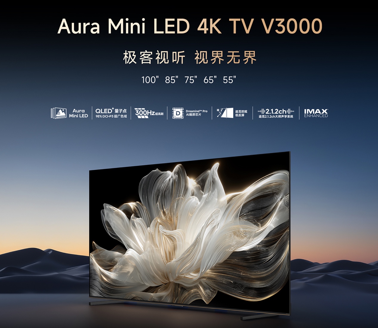 作为凝聚了追觅最前沿显示科技的高端机型,V3000系列率先搭载创新的Aura Mini LED臻彩显示方案。其融合QLED与Mini LED两者的技术优势,可实现10亿+色彩、98% DCI-P3色域和2800尼特峰值亮度——无论是夕阳下的海浪波光、夜空中微弱的星光都能细腻呈现。而搭配了黑晶臻彩屏之后,V3000系列更是实现了178°广视角、7000:1原生对比度和1.8%超低反光率。无论从客厅哪个角度观看,屏幕上的色彩都鲜艳一致。在阳光充足的白天也能呈现深邃的黑色和明亮的细节。