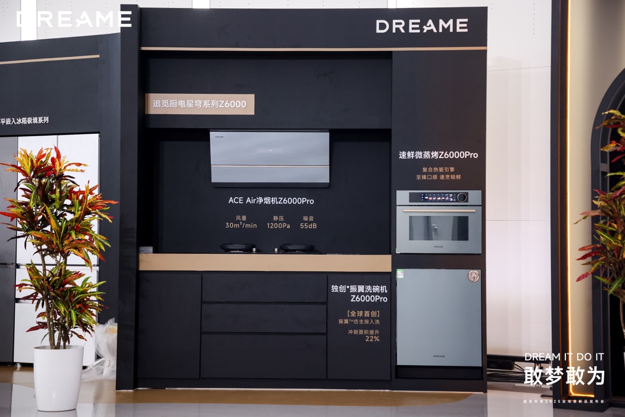 大厨电领域,追觅“星穹系列”重新定义中式高频烹饪。ACE Air净烟机Z6000 Pro以325mm超薄机身和仿生风道引擎实现近吸快排;星焰燃气灶Z6000以BlazeMaster Engine和5.2kW火力覆盖多场景烹饪;速鲜微蒸烤一体机Z6000 Pro通过“微+”复合烹饪与3D炙烤系统实现精准控温与高复热品质;振翼™洗碗机Z6000 Pro采用五维喷淋系统覆盖碗篮死角,并以双烘系统实现快速干燥与抑味防潮。围绕“水—火—烟—烤—洗”,追觅构建了体系化的厨房体验。