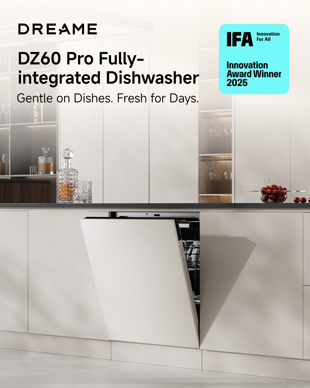 拿下”Best in Home Appliances”称号的追觅DZ60 Pro全嵌式洗碗机,具有360°水旋流洗净系统,搭载3层6个喷臂。独家的FlexWing灵动振翼喷臂,两端可实现25°摆动,在高压水流下实现强力冲净。配合75°C高温煮洗,哪怕碗筷随手摆放,也能获得立体冲涮、洁净如新。这款产品在高效洁净的同时更加节能环保,还具有低能耗和低用水特点。