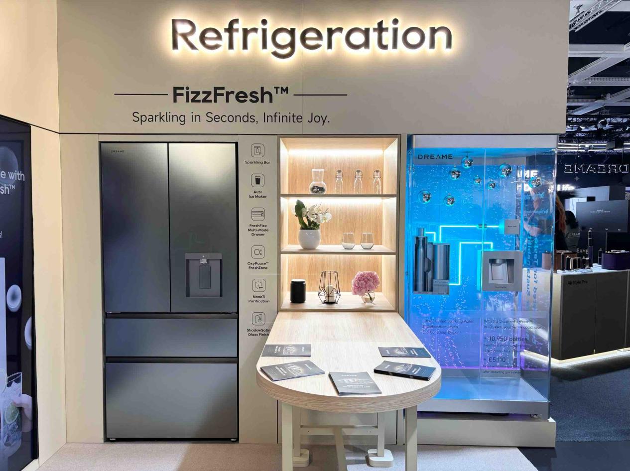 本次展出的FizzFresh™冰箱,搭载追觅科技自主研发的SparklingBar气泡水系统,创新性地将气泡水制作模块集成于冰箱门体,为用户提供随时随地、一键即享的优质气泡水体验:用户可通过门上分配器一键取用冰爽气泡水,无需等待、操作简便;支持三档气泡浓度可调,轻松适配从清淡到强劲的不同口味偏好,适用于佐餐、日常饮用或聚会等多种场景;环保与经济性能突出:可大幅减少瓶装水购买与塑料消耗。以一个三口之家为例,使用该系统10年预计可减少约10,950个塑料瓶的消耗*,同时节省约5,110欧元*。(按每人日均饮用1升气泡水计算,已扣除气瓶使用成本,瓶装水价格按0.8欧/瓶估算)