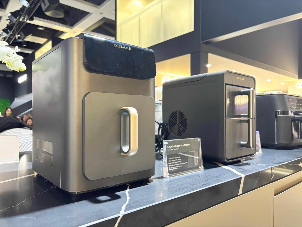 本次展会同期亮相的多款高端家用制冰机,凭借精致设计、快速制冰与便捷体验,成为现场瞩目的焦点。Aura Bullet子弹冰制冰机、CrystalCube方块冰制冰机及CrispBite咀嚼冰制冰机系列,以多样冰型选择和卓越性能,满足家庭不同冷饮需求。外观采用黑金轻奢配色,简约中彰显格调,小巧机身与流畅线条完美融入现代家居环境;搭载高效制冰系统,快速产出纯净冰粒,随时满足派对、日常饮品及休闲时刻的用冰需求;独立抽拉式水箱与储冰盒设计,取冰加水更为轻松,清洁维护简单省心;除此之外内置自清洁功能,一键启动即可自动清洁内部水路,确保冰品洁净健康。