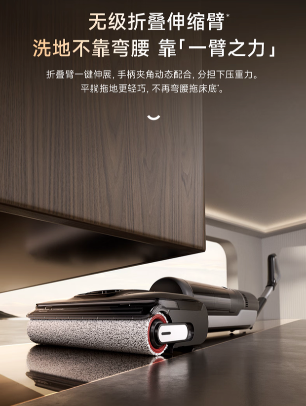 在许多家庭里,床底、沙发底的灰尘积累一直是清洁痛点。老人弯腰吃力,年轻人拖久了容易腰酸背痛,很多人干脆选择“放任不管”。T40 Fold的无级折叠伸缩臂支持0°~90°自由折叠,最大可伸展至145mm。用户只需轻按折叠键,就能让机器探入低矮角落。