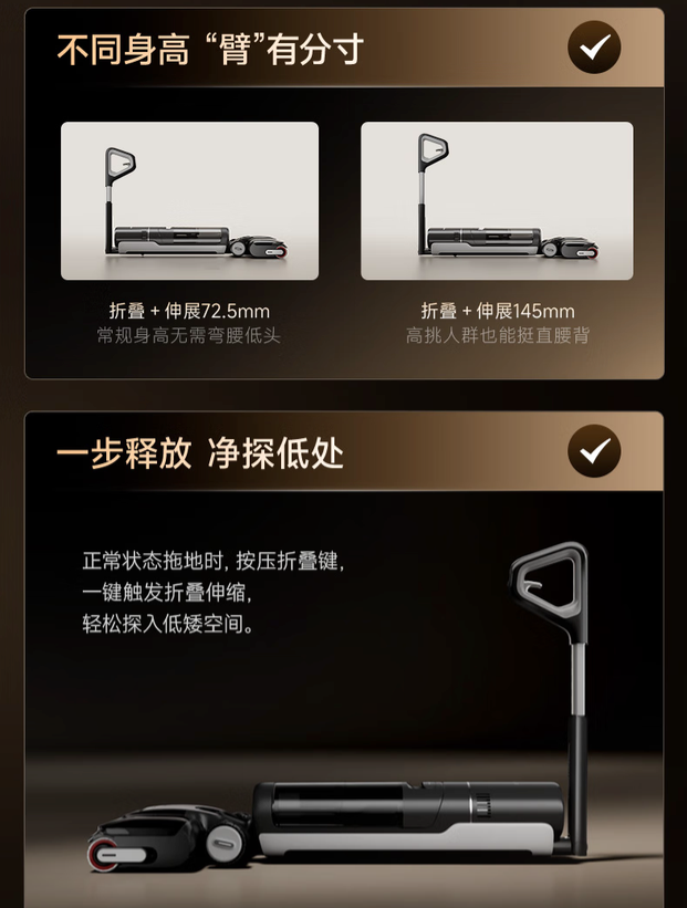 相比之下,行业内的折叠设计大多只能伸展100mm左右,操作僵硬、体验有限,无法真正解决“免弯腰”的痛点。而追觅折叠平躺洗地机T40 Fold的设计则更加友好,不论是高个子还是常规身高,都能直腰完成清扫。