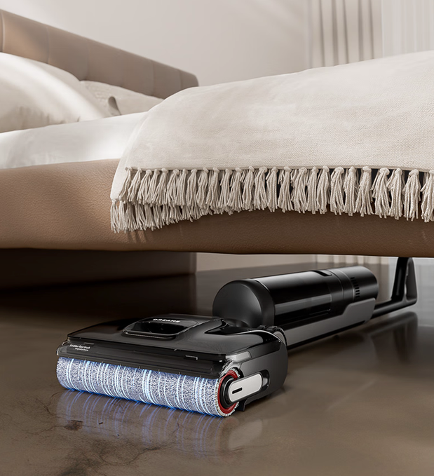 此外,市面上大部分普通洗地机平躺后吸力下降明显,床底清洁往往只是“走过场”。而T40 Fold采用分轨式水气分离技术以及密封锁水舱式清水箱,即使180°完全平躺,也能保持稳定吸力,且不会出现水流回流的情况。20000Pa飓风吸力、80mm宽吸口配合160°黄金吸角设计,使得灰尘、毛发在床底、柜底都能被一次吸净,不留卫生死角。这让用户在真正的使用场景下,能看到肉眼可见的清洁差别。