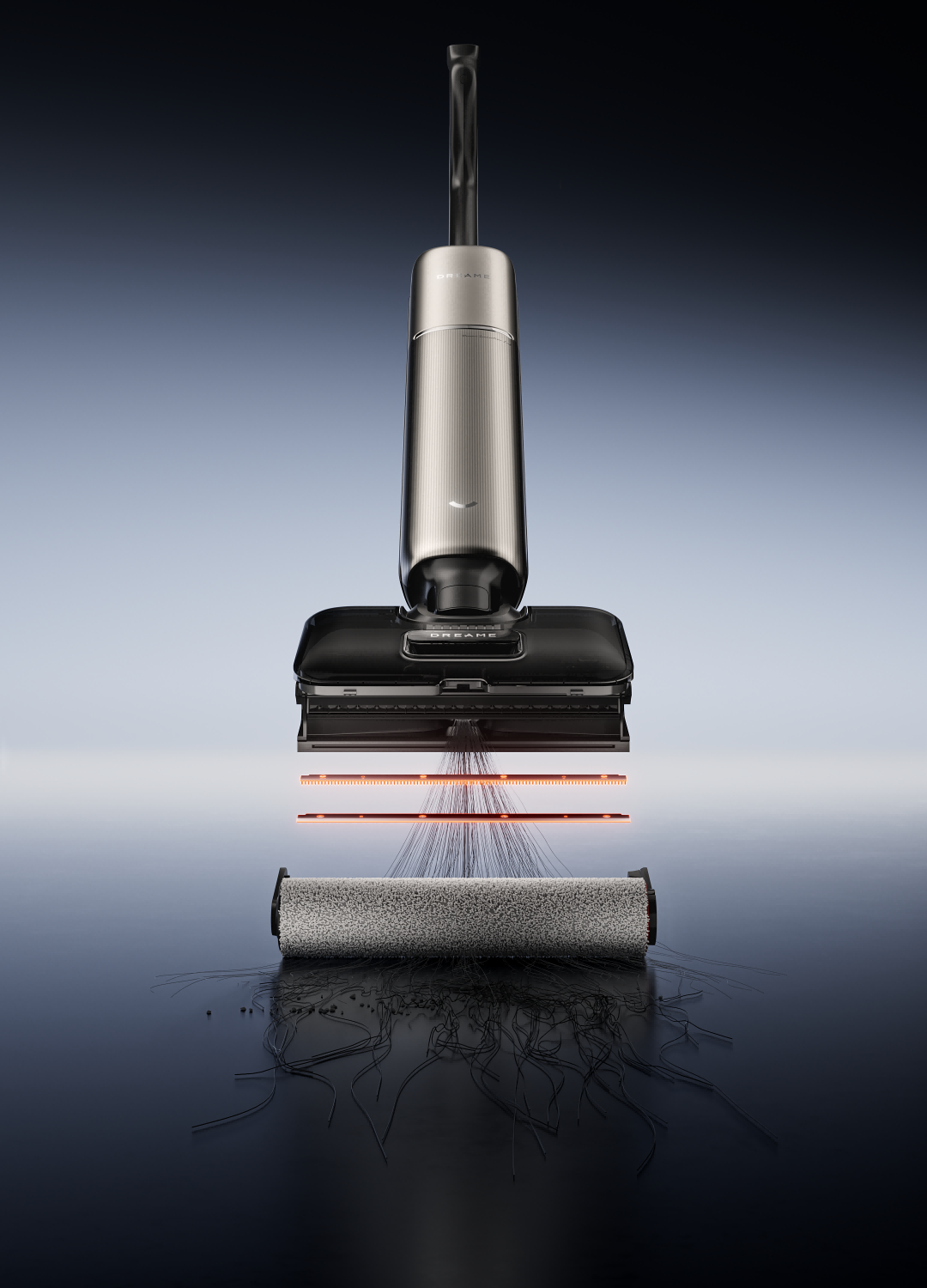 究其根本,传统洗地机的滚刷本质上就是“毛发收集器”。湿漉漉的发丝混着灰尘和毛团,越转越紧,越拖越脏,不仅影响清洁,还容易损耗电机。