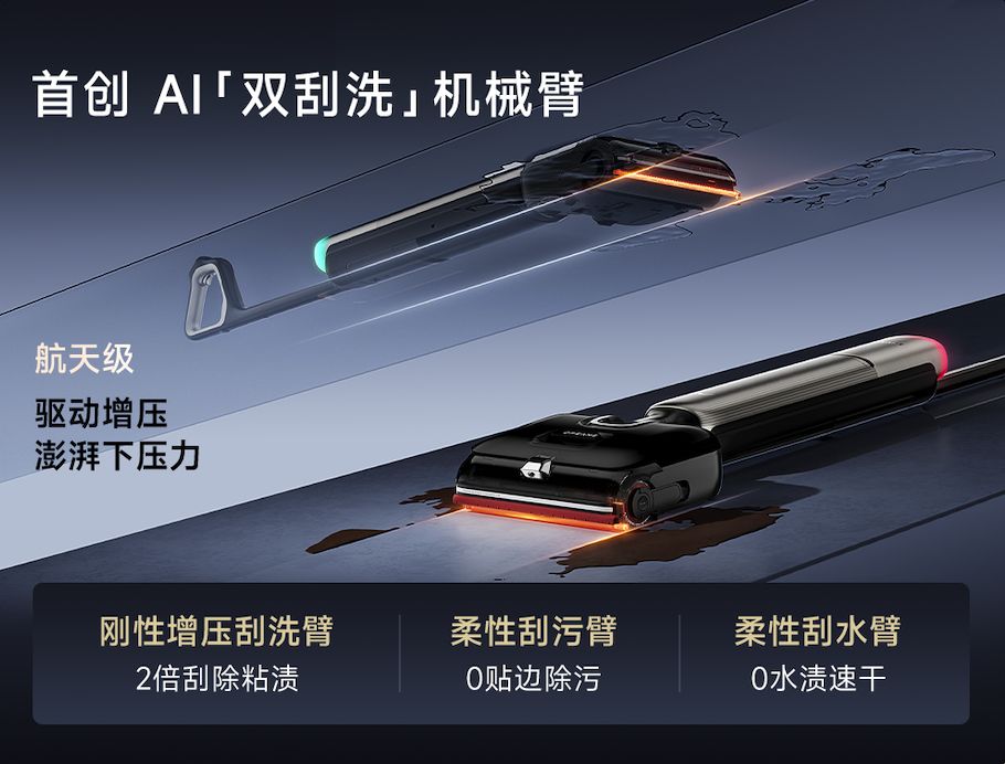 当行业仍在围绕“吸力”内卷时,追觅洗地机率先关注到用户对“边角够不到”的吐槽。传统洗地机清洁后,用户往往还需二次手动处理,既费力又影响体验。为此,追觅推出了全球首款灵捕AI升降机械臂,彻底解决边角清洁痛点。最新一代T60 Ultra更进一步,搭载全球首创AI「双刮洗」机械臂,通过刚性与柔性机械臂的协同,加持具身智能,让洗地机具备类似“双手协作”的清洁能力,对顽固污渍与边角实现全面覆盖。迄今,追觅机械臂洗地机全球销量已突破70万台,成为行业销量最高的机械臂洗地机品牌,让数十万家庭不再为边角清洁烦恼。