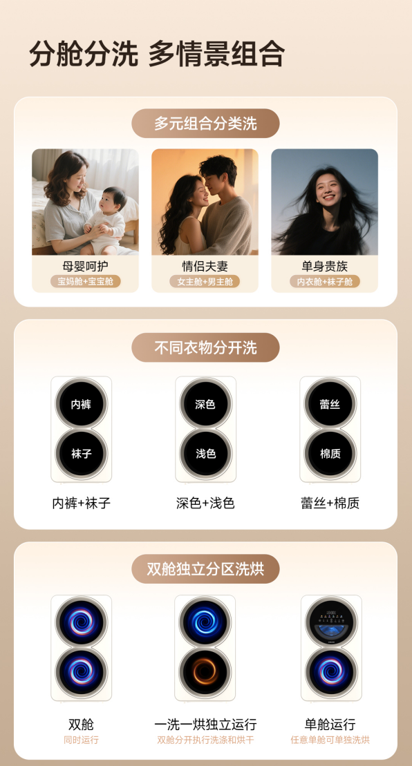 这种设计不仅仅是形式上的改变,更是洗衣理念的根本革新。它将"分类洗涤"从一种理想化的建议转变为轻松可行的日常实践。用户不再需要为了健康洗衣而反复分批操作,大大节省了时间和精力。