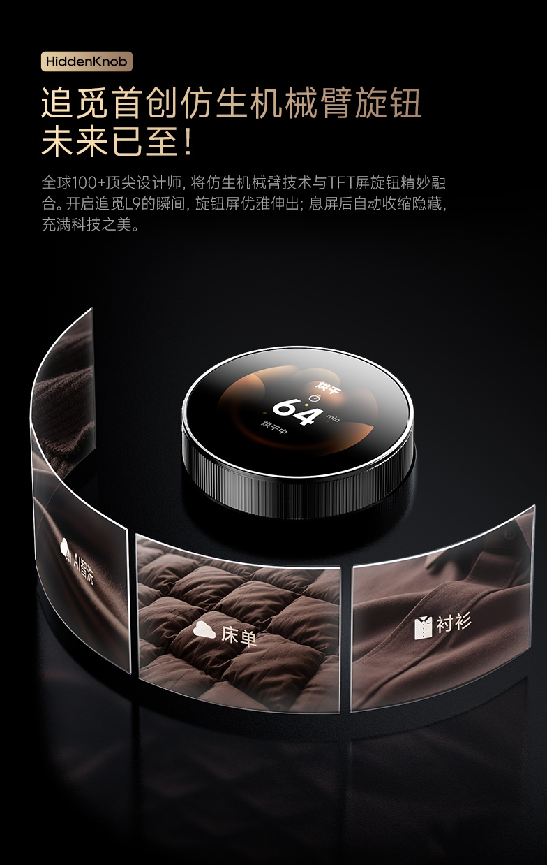 表面处理上,L9 在触控与交互做了细腻的搭配:追觅首创·HiddenKnob仿生机械臂旋钮,使用时,无声升起,精准响应,毫秒级触控丝滑选择各类AI洗烘程序,20万次使用寿命让科技完美陪伴用户。