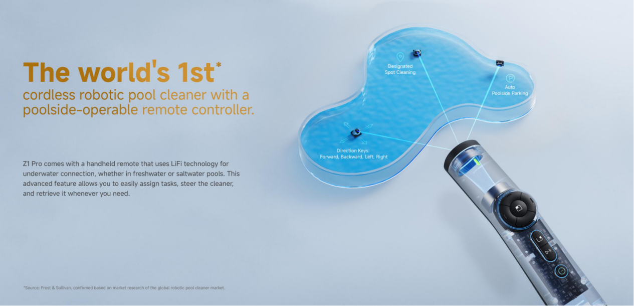 此外,配套 LiFi 光通信遥控器,可在水下自由控制机器人移动,轻松实现前后左右移动、定点清洁、暂停/继续、一键挂岸等操作。即使是盐水泳池,信号依然稳定可靠。