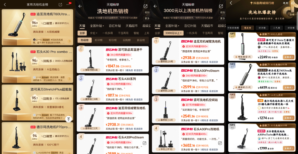 其中,追觅T60 Ultra洗地机登陆京东家用洗地机金榜Top 20、抖音商城洗地机爆款榜Top 5,成为该榜单唯一一个高端旗舰级产品,成为高端洗地机品类中备受用户信赖的代表作。追觅T50 Ultra则双双获得天猫洗地机热卖榜及3000元以上洗地机热销榜Top 1。