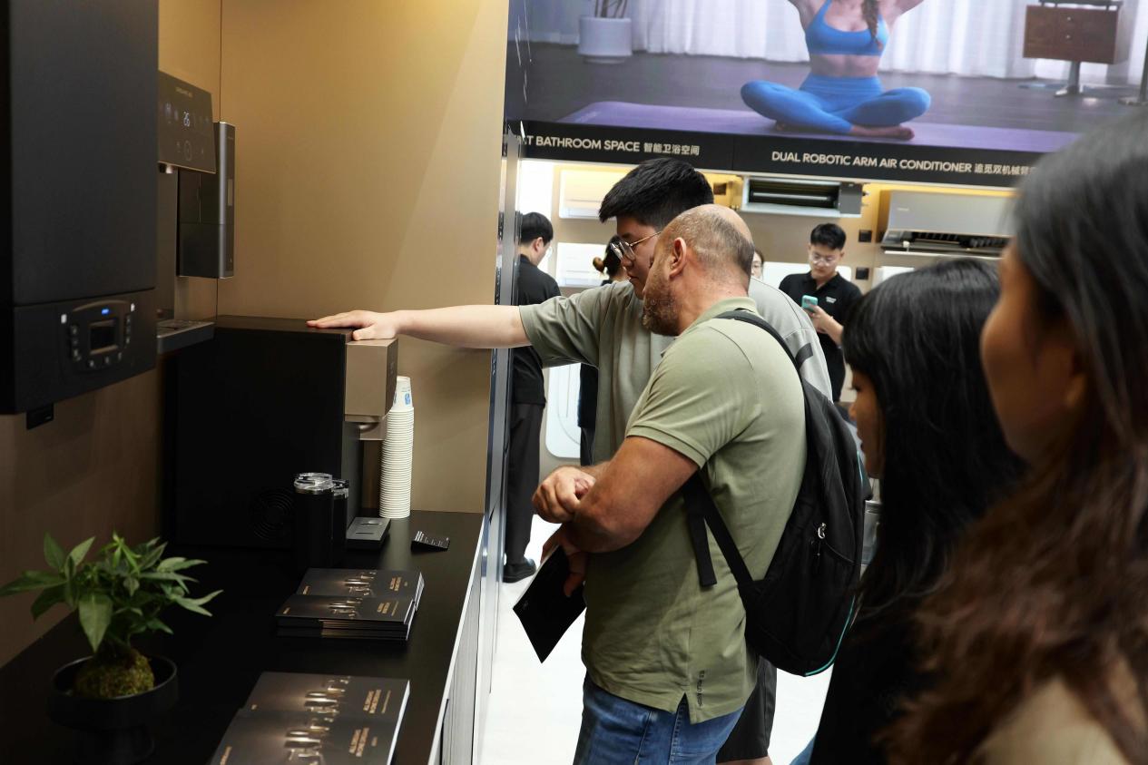 海外经销商们排队体验追觅S1净饮机的三合一功能——能在0.09平方米占地内同时提供冰水、热水和净水。