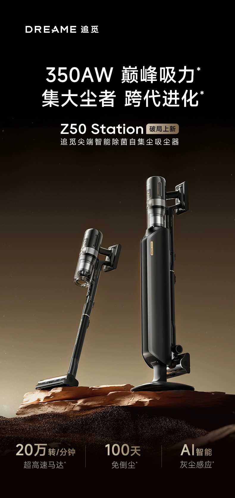 如今,我们再次回到用户需求的起点,会看到底层技术积累后,功能创新已是水到渠成。Z50 station这一搭载巅峰技术的先锋产品,以350AW的吸力,兼顾了“吸力+效率”这一复合参数重构性能标准,直观高效解决了用户对于“一次清扫彻底性”的根本需求;智能除菌自集尘功能,仅需10秒就能完成集尘,集尘效率达到98%,且能做到100天免倒尘,终结了清洁后的维护难题;AI智能灰尘感应系统,根据灰尘量精准调整吸力,实现清洁效果与能耗的最优解。