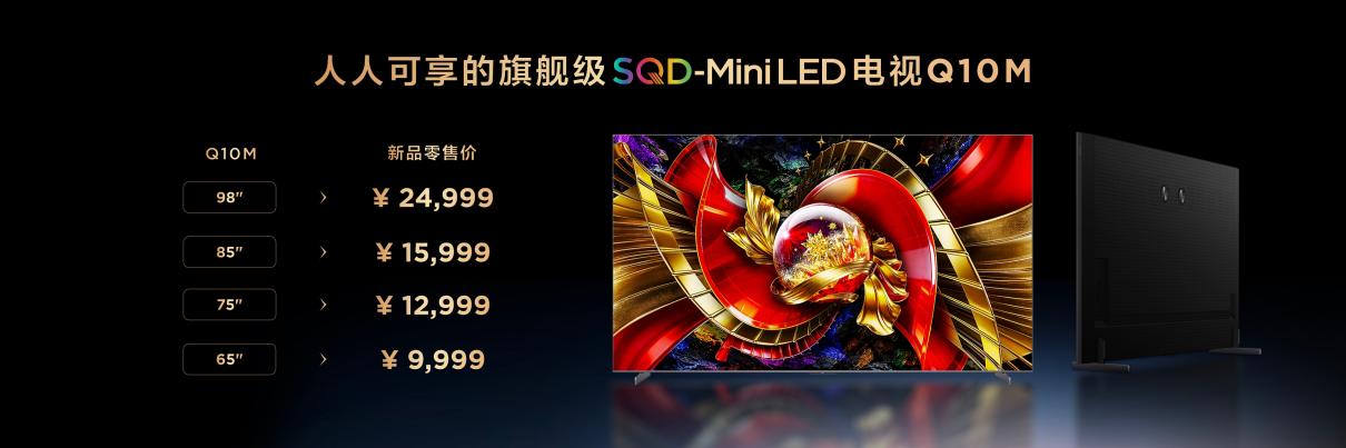 与此同时,人人可享的SQD-Mini LED旗舰级产品TCL Q10M也一并上市,同样搭载SQD-Mini LED技术,拥有碾压同价位产品的100% BT.2020全局高色域,配备最新的超级量子点技术,屏幕也直接一升到顶,配备超级蝶翼华曜屏,98吋、85吋、 75吋、65吋零售价分别为24999元、15999元、12999元、9999元。作为技术普惠的标杆之作,Q10M代表着TCL大幅降低了SQD-Mini LED体验门槛,让用户真正触手可及。