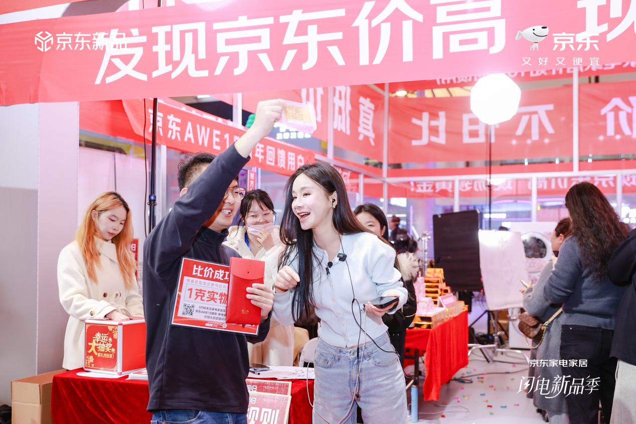 3月11日晚8点至3月15日,用户可用京东自营的家电商品价格,与其他平台头部主播直播间、品牌官方旗舰店同款产品进行比对,若发现京东价格高,消费者可在京东家电家居采销直播间申请与主播连线,并提供相关低价线索。若符合规则比价成功,相关商品将现场调价至95折,确保所有消费者都能买到最便宜的商品。在AWE现场参与比价并成功的用户,可免费领取1克实物黄金;在线上直播间连麦比价成功的用户,京东会按当日金价折算,发放等值1克黄金的京豆奖励。