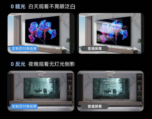 创维100A4F采用了半导体显示产业的头部企业京东方(BOE)特别定制的百吋类纸屏,其中的纳米蚀刻技术会将屏幕表面的光线漫反射到不同角度,在阳光充足、视野开阔的大厅,显示效果不受强光干扰,在夜晚客厅灯光众多的情况下,屏幕也不会有倒影,保证了观影沉浸感。同时拥有178°超广视角,还能根据环境光线进行亮度自适应调校,真正实现“0反光、0眩光、0指纹”。