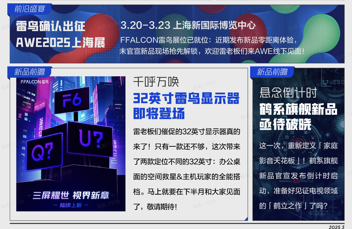 继2023年成功开辟显示器赛道后,雷鸟U8(27英寸版本)成为去年的MiniLED显示器的大热门单品,雷鸟此次携首款31.5英寸直屏QD-MiniLED显示器32U8高调亮相。该产品凭借1400背光分区、HDR1400认证及百万级动态对比度,重新定义专业级显示标准。