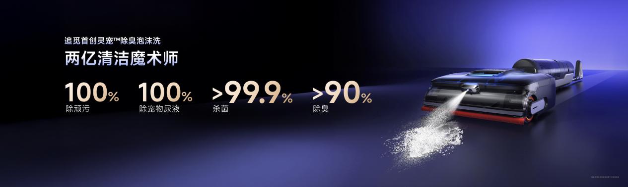 追觅科技以消费者需求为导向,深入洞察用户痛点,攻克各项技术难题,推出行业首创灵宠除臭泡沫洗地技术,创新性地解决了宠物污渍等清洁难题。它通过微分子绵密泡沫定点喷淋,瞬间覆盖污渍,在5分钟内可释放约2.7亿个清洁因子,等待泡沫溶液将污渍分解后,配合21000Pa超强吸力和480次/分钟高频擦地,能够将各类顽固污渍彻底清除,轻松应对所有家庭重污场景。