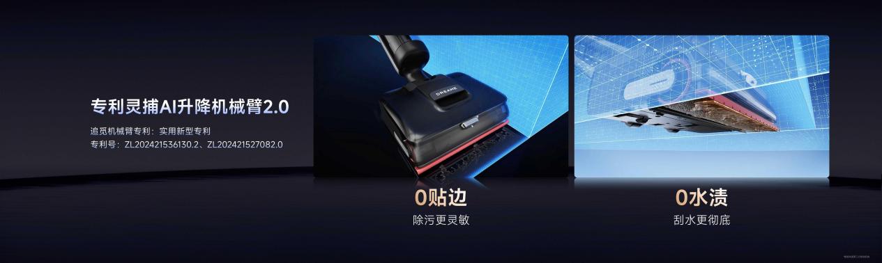 针对边角、缝隙等深度清洁的难题,T50 Ultra洗地机搭载了追觅专利灵捕AI机械臂2.0。通过AI技术的精准感知,机械臂能够实时发现并捕捉污渍,回拉时机械臂抵达边缘自动下压,迅速捕捉边角的污渍。其微秒级的极速升降功能确保了水渍的即时清除,实现了“即擦即干”的高效清洁,达到了真正意义上的“0贴边、0水渍”的清洁标准。与1.0技术相比,灵捕AI机械臂2.0在捕捉污渍的灵敏度、刮水的稳定性以及使用寿命上都有显著提升,彻底解决清洁死角难题。