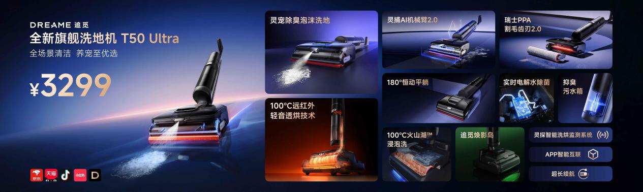 2025年3月19日,追觅科技在「生而无界」2025生态发布会上,正式首发全新T50 Ultra旗舰洗地机。以“灵宠除臭泡沫洗地”、“100℃远红外轻音透烘”、“灵捕AI机械臂2.0”以及“瑞士PPA割毛齿刃2.0”等多项行业首创技术,再一次打破洗地机技术创新上限,为全球家庭带来新一代全场景清洁解决方案。