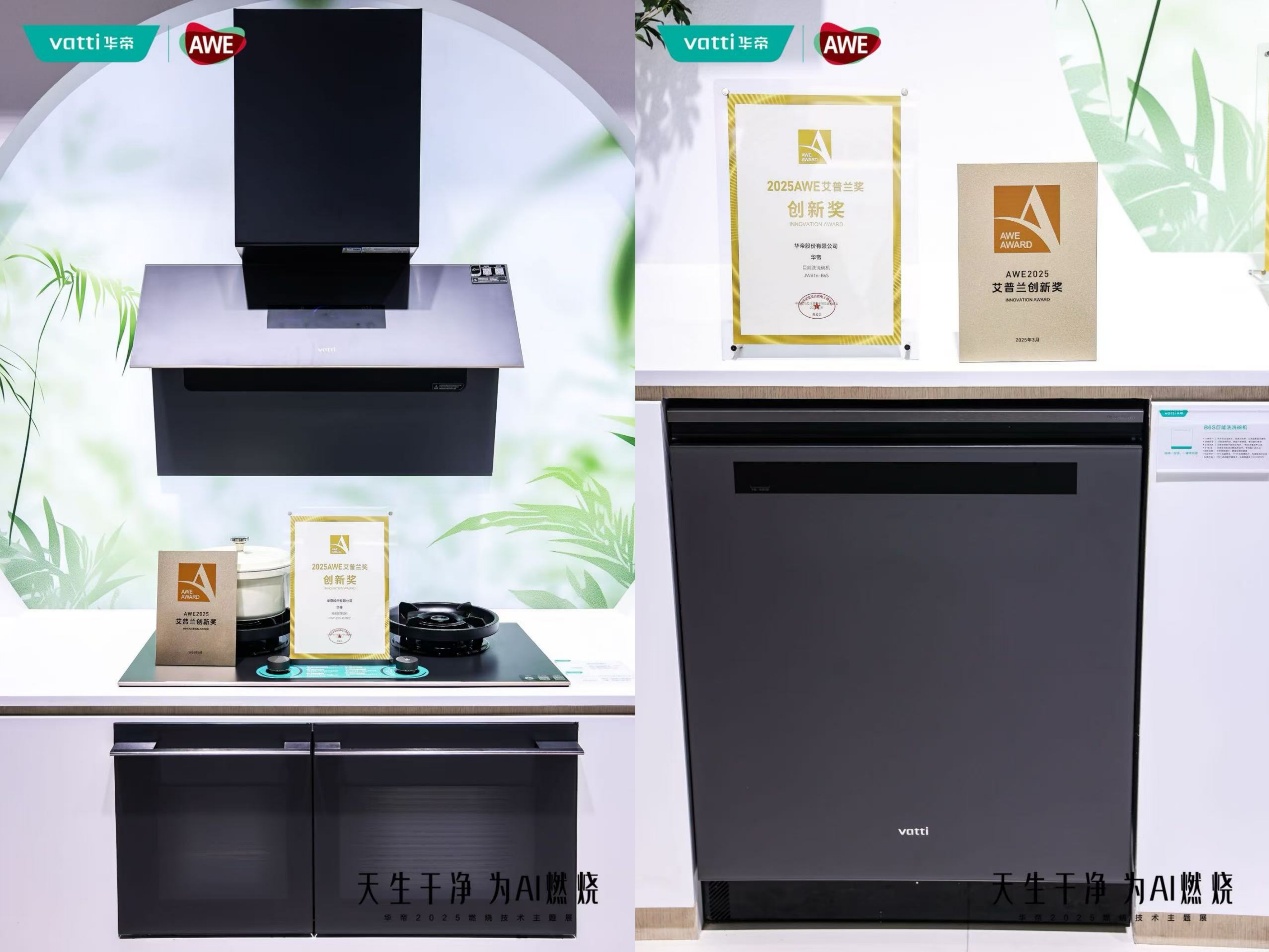 与展会一起揭晓的2025AWE艾普兰奖名单上,华帝凭借技术和产品引领性脱颖而出,摘得“双冠”:新氧超薄烟机CXW-200-J6200Z和“巨能洗”洗碗机JWB16-B6S双双获得“艾普兰创新奖”。