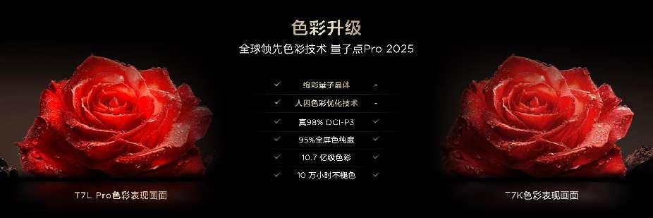 除了分区,亮度也是消费者选购Mini LED电视时最关心的指标之一。T7L Pro系列将XDR 1600nits升级为绚彩XDR 2200nits,不仅峰值亮度提升,而且亮得更持久、亮得更出彩、亮得更护眼。色彩方面也由量子点Pro 2024升级为最新的量子点Pro 2025,从量子点材料到色彩算法全面升维,实现真·98%DCI-P3超高色域,让显示画面更真实地还原现实世界,真正做到十亿原色屏,十年好色彩。