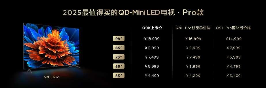 此外,TCL Q9L全系3个尺寸,85/75/65英寸,新品零售价分别为8999/6799/5499元,国补后仅需7199/5439/4399元。而TCL Q9L Pro全系更是提供了5个尺寸,98/85/75/65/55英寸,新品零售价16999/9999/7499/5999/4299元,国补后分别仅需14999/7999/5999/4799/3439元,重塑行业价值标杆。两大系列新品覆盖主流至高端市场,均为各自价位段的王炸产品,以极致质价比推动高端体验回归大众消费本质,并进一步巩固“买Mini LED就选TCL”的市场共识。