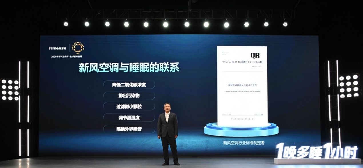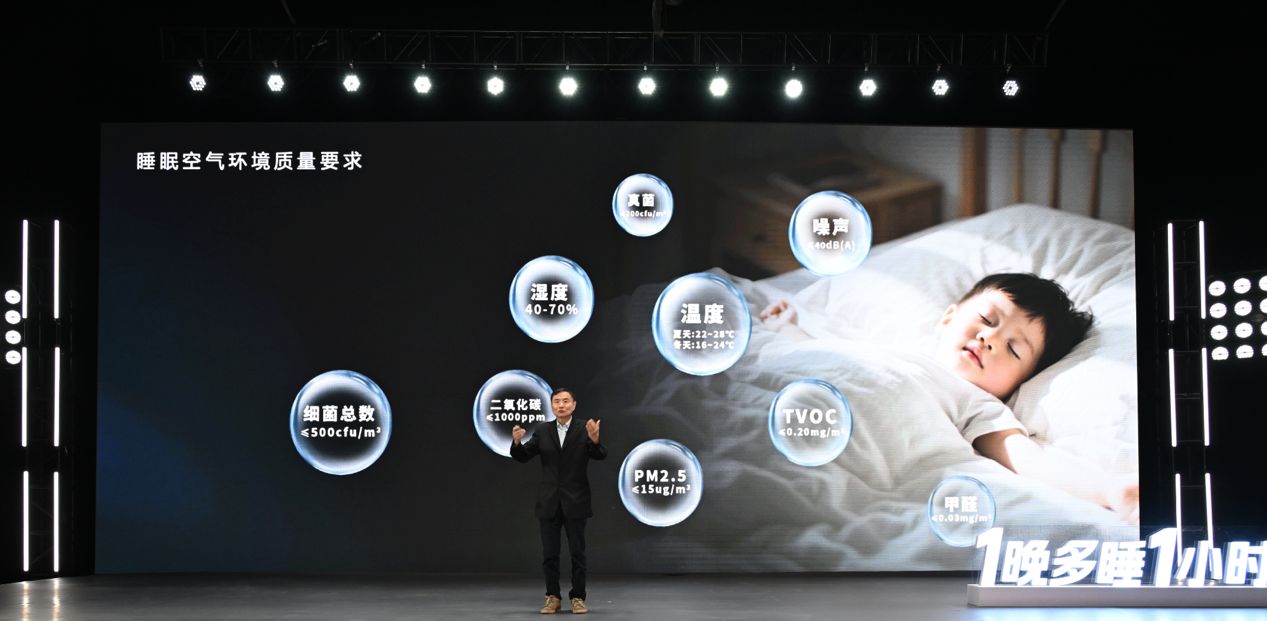 5月12日,在刚刚结束的“1晚多睡1小时—海信空调新风生活方式发布会”上,海信正式推出新风空调健康睡眠解决方案,并联合中国睡眠研究会、中国家用电器研究院等多家权威机构正式发布《新风空调助眠白皮书》。现场多位专家表示,睡眠问题已成为都市人的“奢侈品”,上海交通大学教授吴吉祥在主题发言中,从科学视角阐释睡眠对CO₂、甲醛、TVOC等环境质量的要求,并指出新风系统可有效降低二氧化碳浓度、减少污染物、去除异味,对提升睡眠质量具有不可忽视的作用。