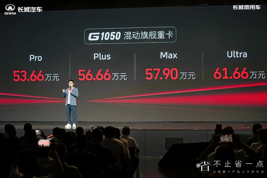 发布会上,长城商用车营销总经理常志贤宣布长城G系列混动重卡旗舰车型G1050正式上市,售价为53.66万起,同时推出极具诚意的三大首销福利和三大保障政策。前200台用户可享受“不省油就退钱” 、三年维保全包服务以及保证三年残值不低于 50%的首销福利。