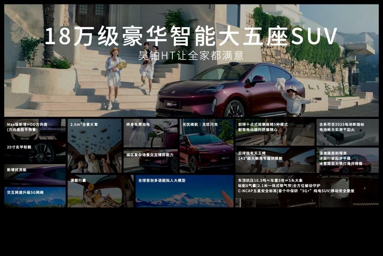定位18万级豪华智能大五座SUV的昊铂HT,以全方位的豪华领先,满足家庭用户的豪华出行生活。空间上,昊铂HT拥有2935mm的超长轴距,以大五座体量的空间设计让全家满载出行能坐能装。在用户关心的续航补能上,昊铂HT以行业首创“双800”带来长效坚实的续航能力和极致补能体验;豪华舒适的诠释,昊铂HT座椅全系标配Nappa真皮,前排座椅配备十点按摩,同级唯一后排天王椅支持143°最大躺角,以舒适满溢的配置享受重新定义豪华驾乘。