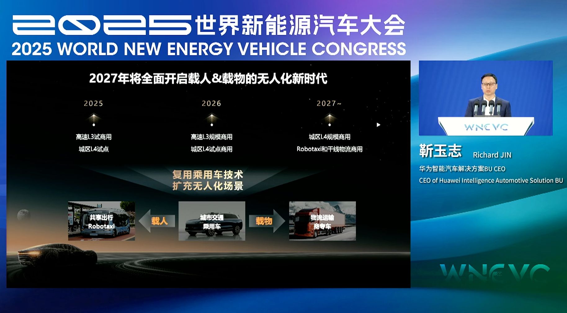 在技术发展路径上,靳玉志介绍了华为乾崑的阶段性规划。2025年,ADS 4系统首发面向L3技术架构的高速商用解决方案,具备高速L3试点商用能力及城区L4测试能力;2026年,在法规允许前提下,力争实现高速L3规模商用及城区L4商用试点;2027年,随着高速与城区NCA功能普及,L3将实现规模放量,城区L4进入商用阶段,Robotaxi与干线物流逐步落地,全面开启载人&载物的无人化新时代。