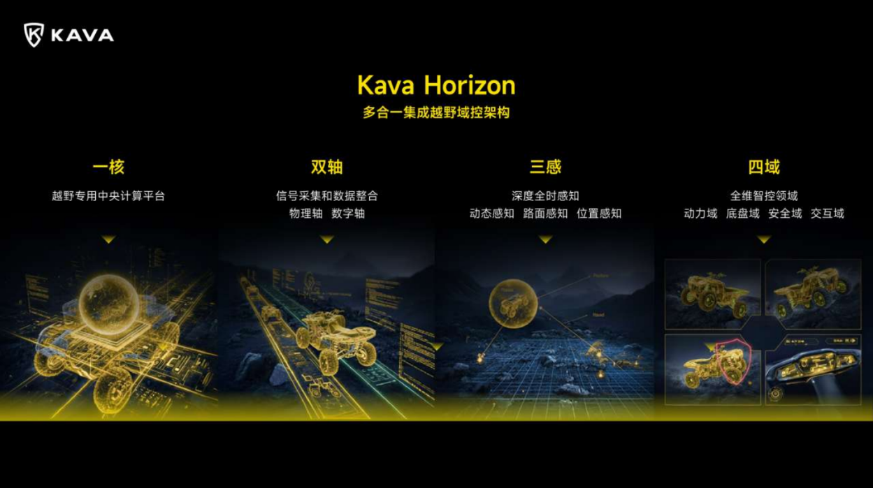 其次,这套系统赋予了车辆“成长”的生命力。传统全地形车从出厂之日起,其性能曲线便注定一路向下。而KAVA通过自主研发的 Horizon中央域控制器,实现了深度的整车OTA能力。未来厂家可以通过软件更新,优化车辆的动力输出逻辑、调整不同地貌下的悬挂表现,甚至增加全新的驾驶模式。车辆从“交付即巅峰”的工业品,变成了可以持续进化的“数字生命体”。产品从一锤子买卖转向全生命周期的服务连接。