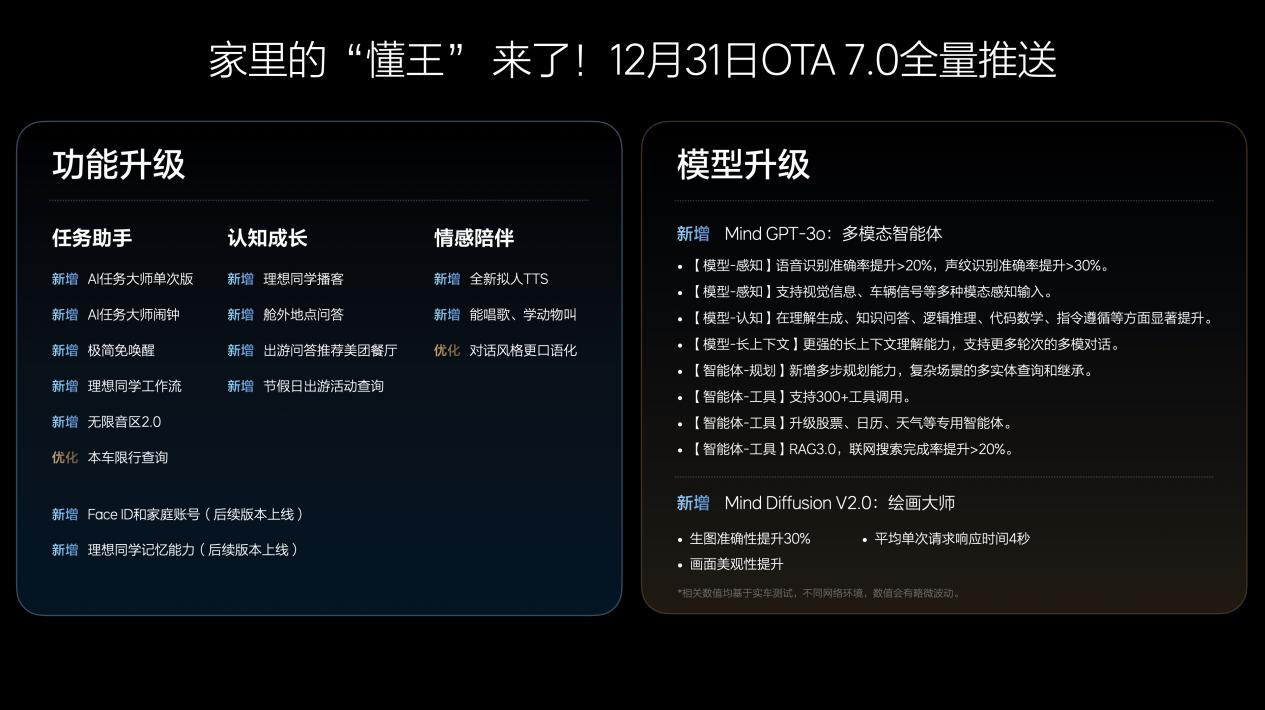 2024年12月25日-27日,理想汽车连续三天推出“2024理想AI Talk”,分享了对人工智能的最新思考,以及包含智能驾驶和理想同学在内的人工智能技术的最新进展,并宣布基于自研基座大模型Mind GPT的理想同学从车机进入手机,App已于12月27日全量上线。此外,理想汽车宣布OTA 7.0版本车机系统将于12月底全量推送AD Max用户,新增AI推理可视化、高速端到端等功能,并实现Mind GPT-3o、Mind Diffusion V2.0的能力升级。