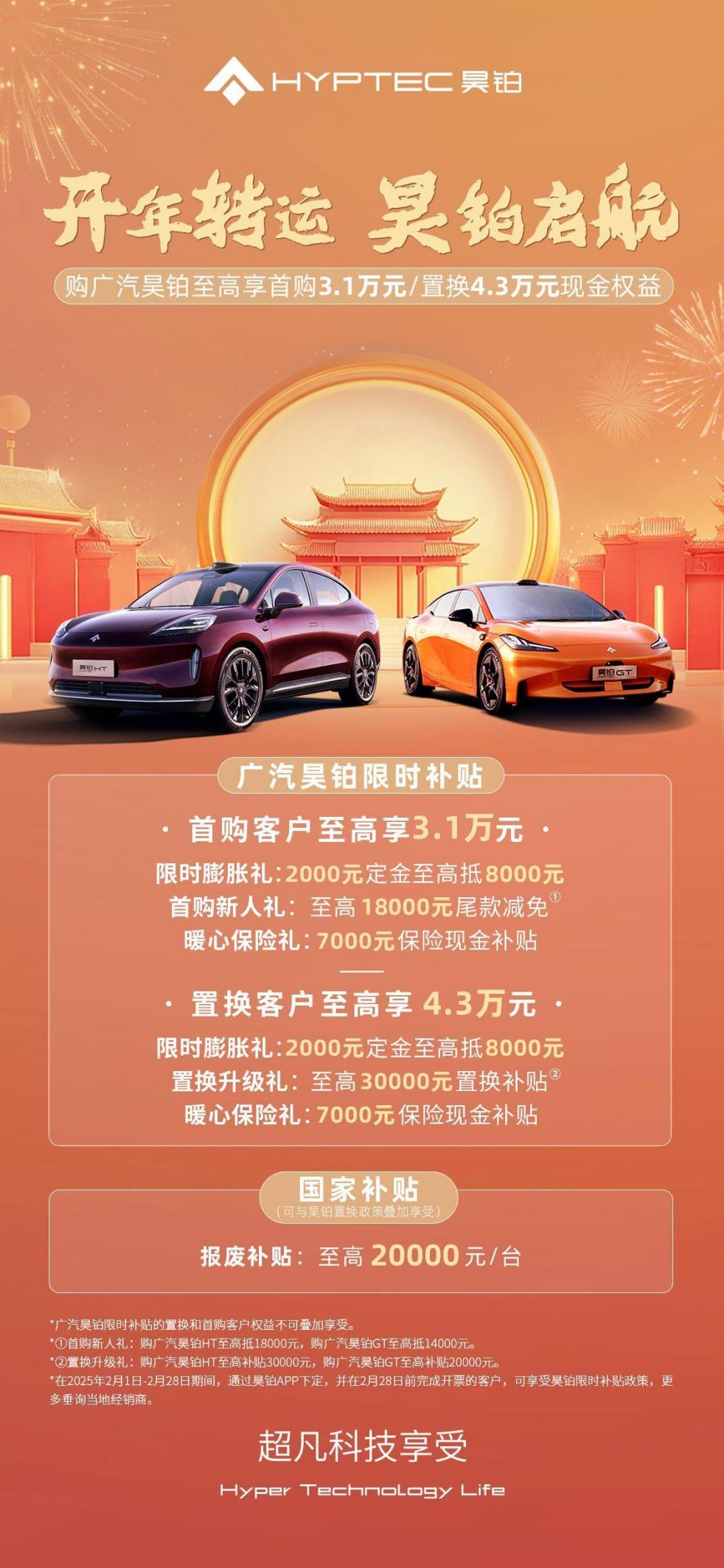 2月6日,广汽昊铂推出“开年转运 昊铂启航”限时补贴政策,涵盖多项现金权益,为用户送到蛇年首份“昊礼”。在2025年2月1日-2月28日期间,通过昊铂APP下订并在2月28日前完成开票的用户即可享受。