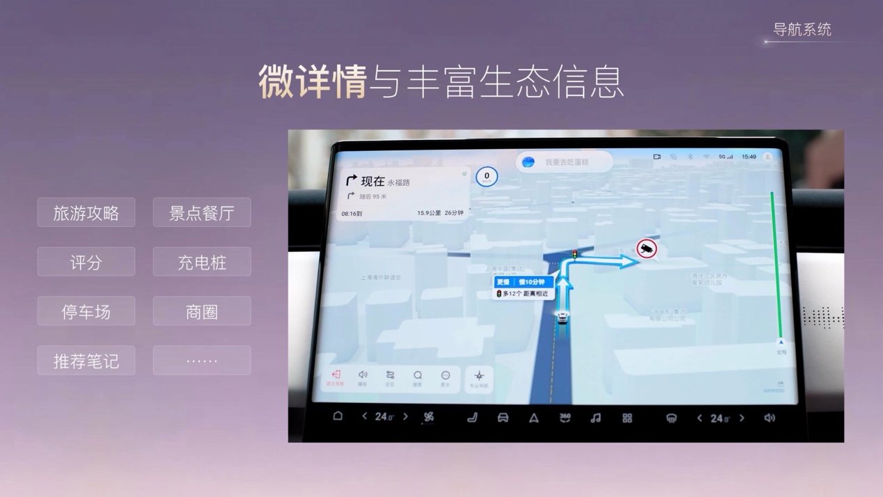 自动推送目的地及周边信息,信息丰富度行业第一:导航至充电站时,支持搜索750V以上超充,地点信息包含闲忙桩数量、充电价格、电压、停车费等;导航至餐馆,支持展示菜系、评分,以及附近部分停车场的车位、价格等等。