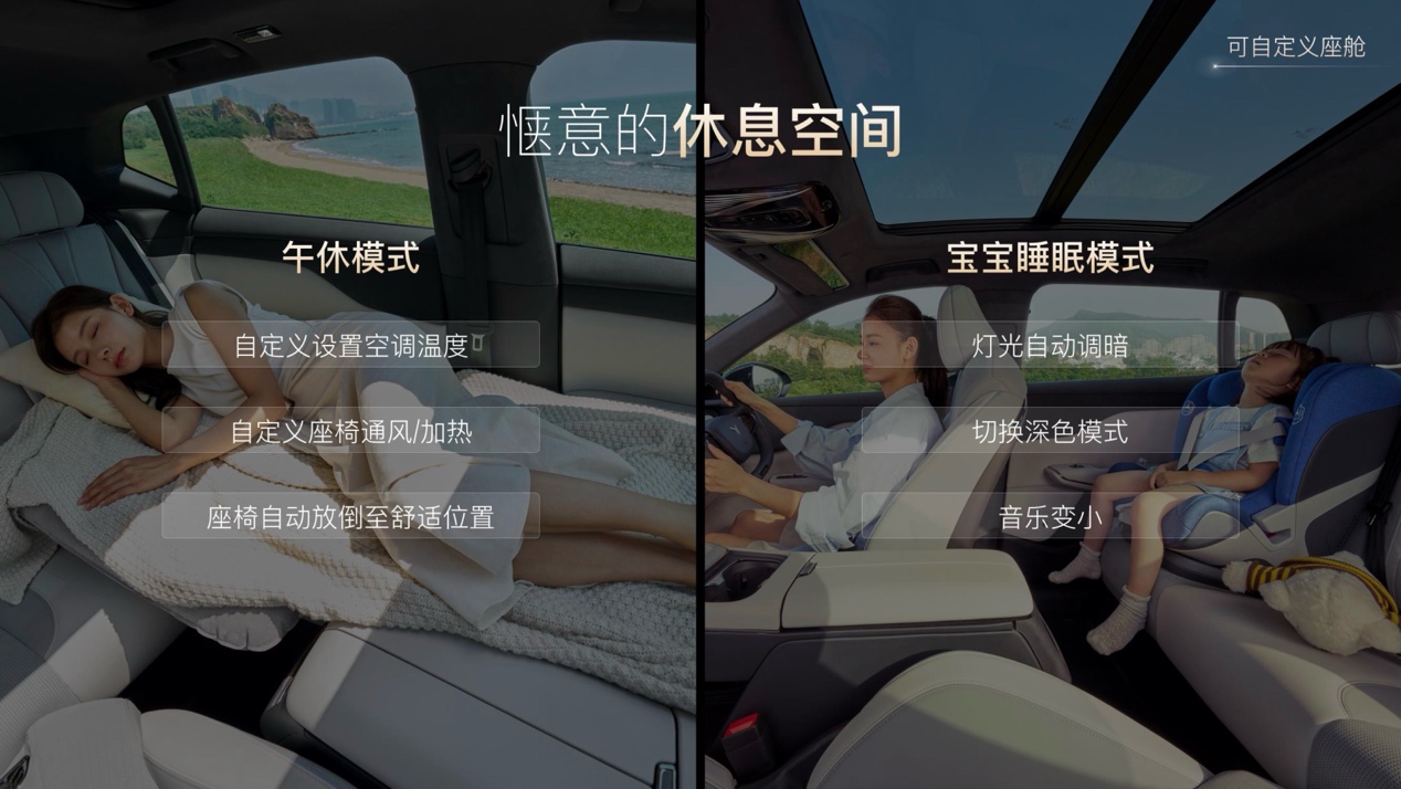 比如,车主可以编排“午休模式”,座椅自动放倒、开启舒缓音乐,一键启动后,岚图知音的座舱秒变惬意的休息空间。让车主在繁忙的工作后,可以在这个专属的休息室里放松身心,快速恢复精力。