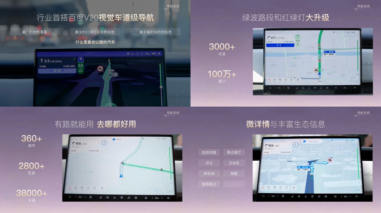 此外,OTA 2.0升级后,岚图知音的视觉车道级导航把便利最大化,解决了传统车道级导航的车道定位漂移痛点,给用户带来优秀的导航体验。该套系统能够覆盖全国360个城市、2800多个区县、38000多个乡镇,其“绿波车速”可根据车速、红绿灯倒计时等综合推算,显示顺畅通过路口的建议时速,如同电影情节般绿灯通行各个红绿灯路口。而且,该套系统能自动推送目的地及周边信息,比如导航至充电站时,支持搜索750V以上超充,地点信息包含闲忙桩数量、充电价格、电压、停车费等。
