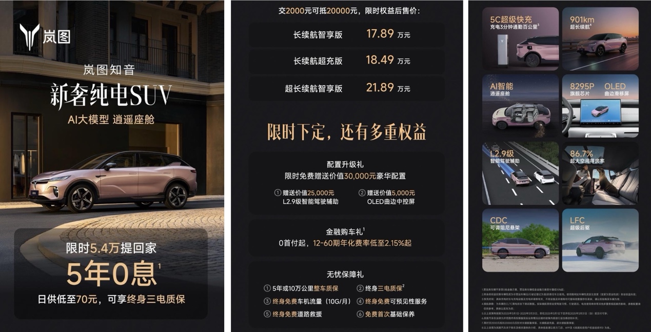 据悉,在3月31日前,下定岚图知音的用户不仅仍然享受“2千抵2万”的福利政策,限时权益售价17.89万起,还能享受“5年0息”政策,限时5.4万就能把岚图知音开回家。此外,还有终身三电质保在内的多重权益。同时,还能叠加2025年国补政策。