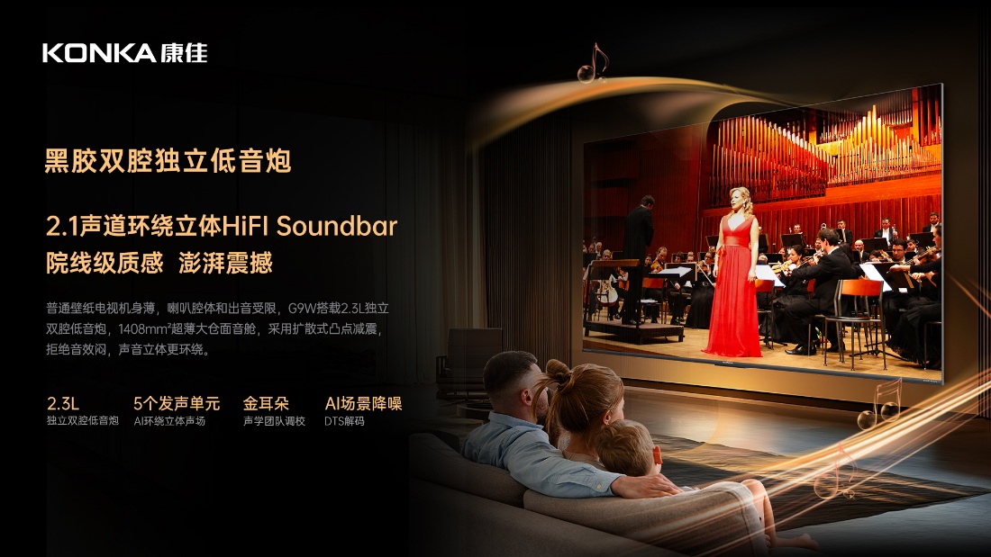 在音质表现上,康佳G9W配备了2.3L黑胶双腔独立低音炮,显著增强了低频表现,使得低音更加浑厚有力。无论是电影中的爆炸场面、战斗场景,还是音乐中的鼓点、贝斯等低频元素,都能得到清晰且深沉的呈现,带来层次十足的听觉体验。