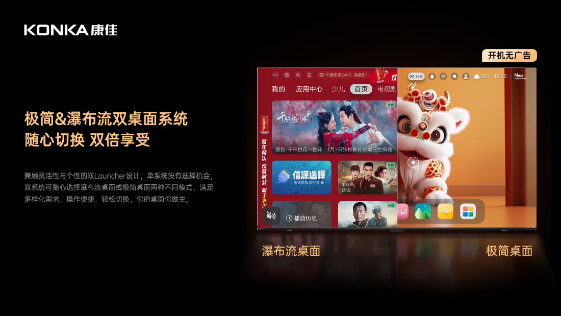 在应用方面,康佳G9W还突破了传统单一操作系统的局限性,通过创新的双Launcher设计,巧妙地融合了灵活性与个性化需求。它提供了极简和瀑布流两种桌面模式供用户选择,让我们能够根据自己的喜好和需求自由切换,操作简便,一键即可完成转换,真正实现了“个性化桌面,自主掌控”。康佳G9W的易AI分屏功能更是将电视屏幕巧妙地一分为二,允许同时显示两个不同的内容源,老公打游戏,老婆追剧,不要太方便。