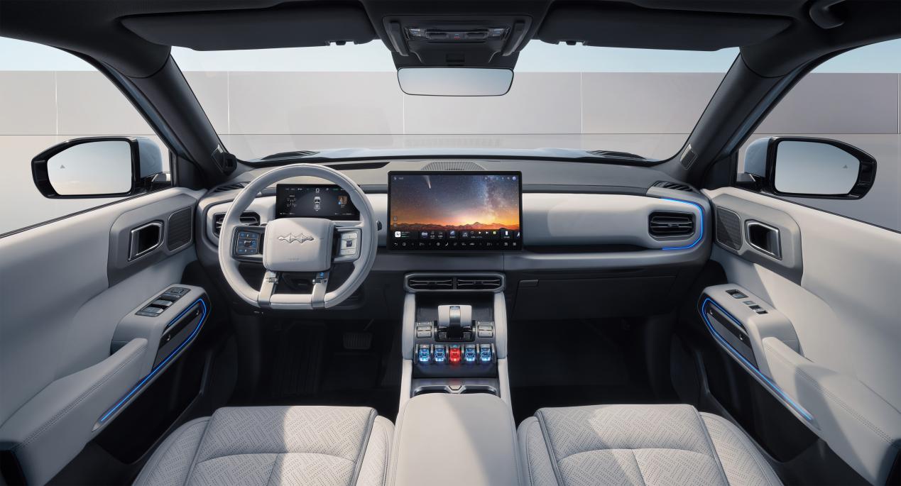 方程豹钛3的设计语言跳出了传统SUV的框架,以"星际战车"概念贯穿内外。120°星战曲面车身、双线切割灯组、飞翼式工具箱等元素,将几何美学与机能感完美融合。座舱内,C型星际氛围灯随音乐律动,战车水晶档把与15.6英寸中控屏形成科技仪式感,而压缩机冷暖冰箱、帝瓦雷音响、人体工学座椅等配置,则将"舒享"从概念落地为触手可及的自由——无论是露营时的冰镇饮品,还是长途驾驶中的沉浸影音,场景适配能力远超同级。
